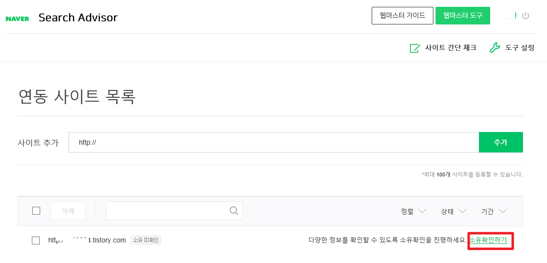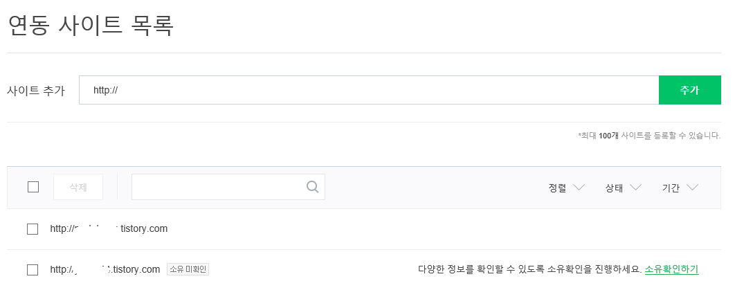 연동 사이트를 최대 100개까지 등록할 수 있는데요. 소유확인이 안 돼 있으면 웬지 찜찜하지 않을 수 없습니다.