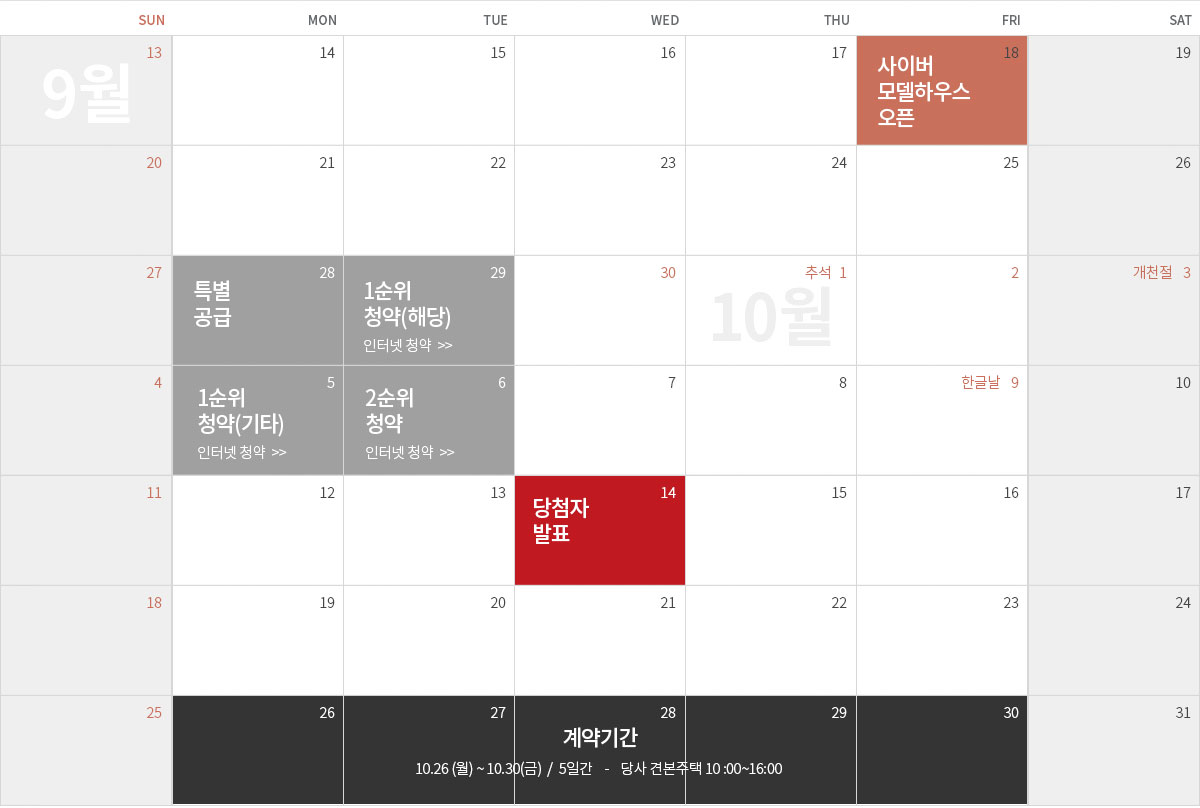 9월 28일(월) 특별공급을 시작으로 9월 29일(화) 1순위 당해 지역, 10월 5일(월) 1순위 기타 지역, 6일(화) 2순위 청약이 진행 됩니다.