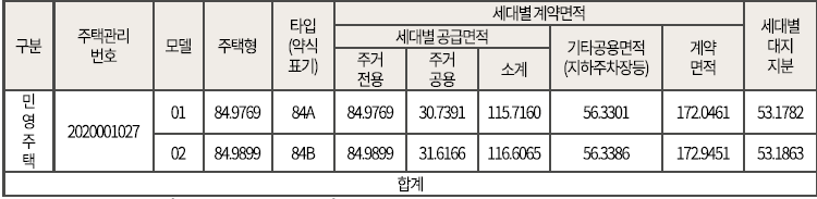 세대별 계약면적 및 공급세대수 안내
