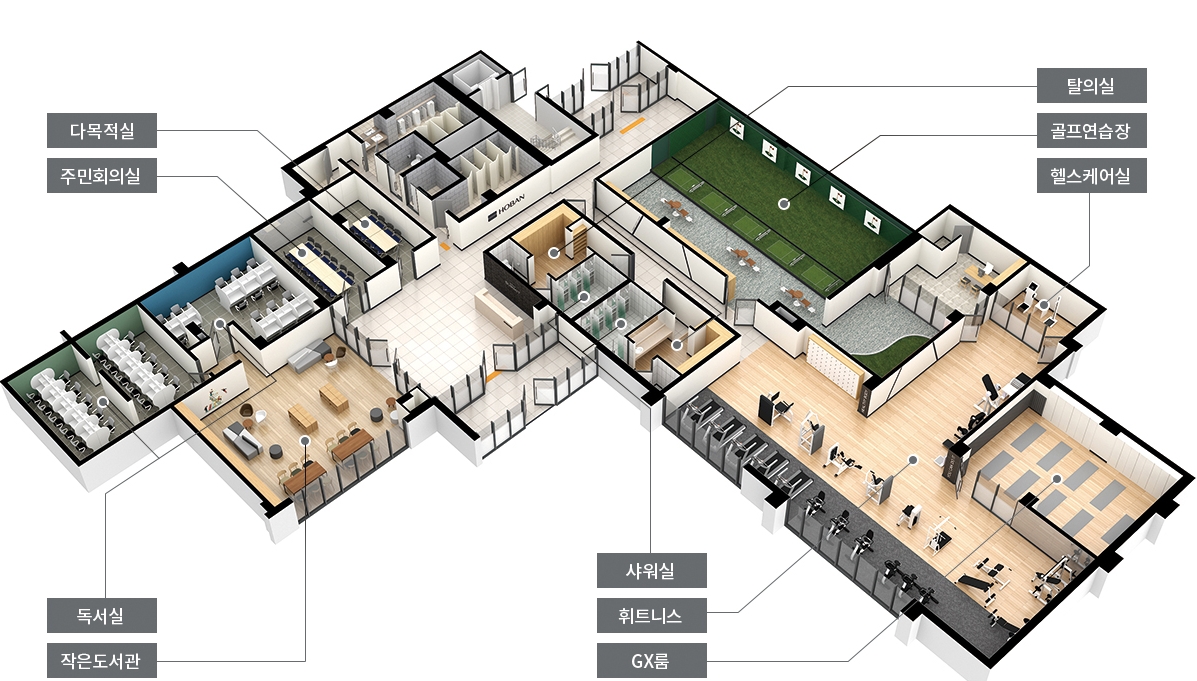 커뮤니티시설에는 피트니스/GX룸, 골프연습장, 작은 도서관, 독서실, 다목적실 등 다양한 공간이 마련됩니다.