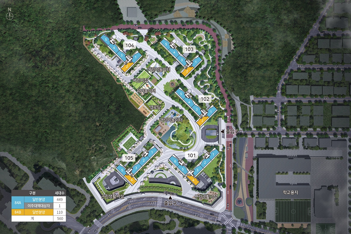 단지는 지하 2층~지상 23층, 5개동으로 총 560가구로 조성되고요. 전 가구가 소비자 선호도 높은 전용 84㎡(A, B타입)로만 구성됐습니다.