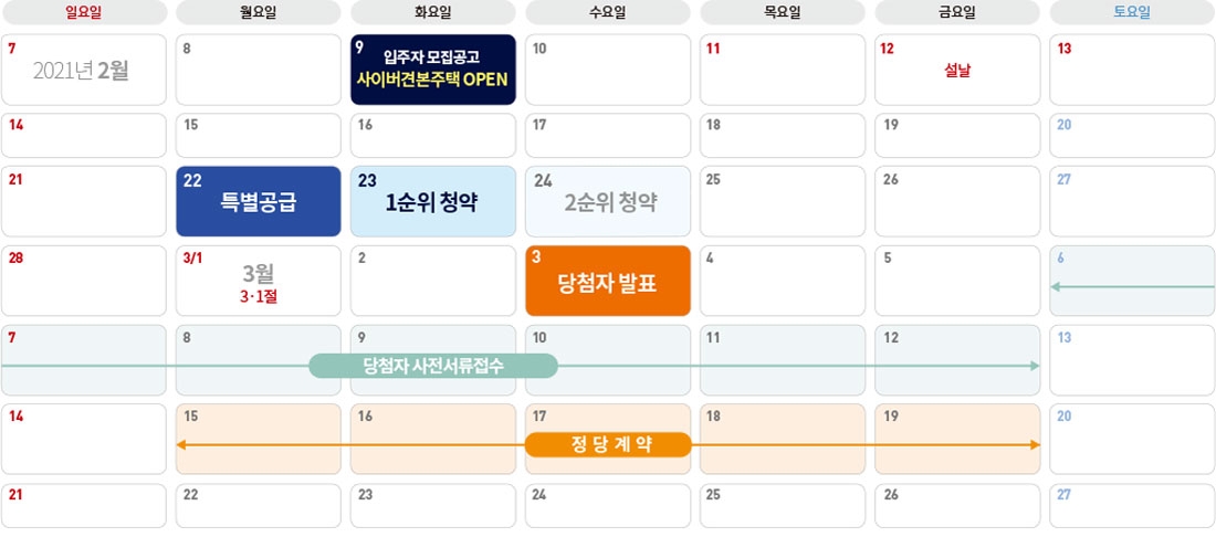 2월 22일 특별공급을 시작으로 23일 1순위, 24일 2순위 청약을 한국부동산원 청약홈을 통해 접수 받습니다.