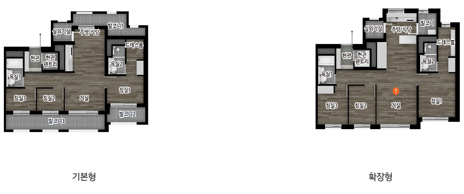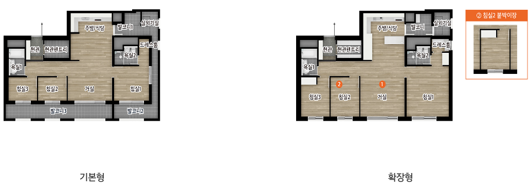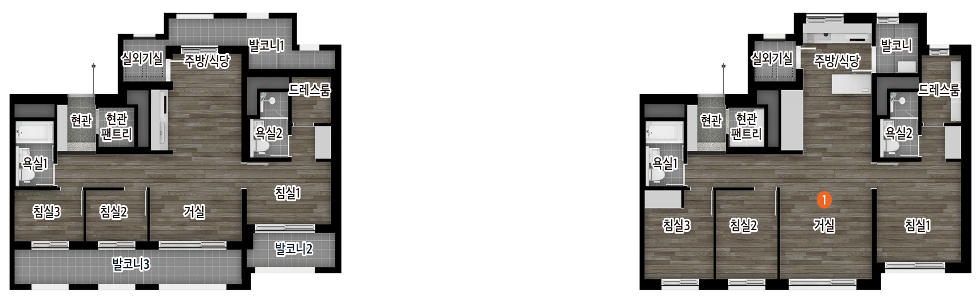 아일랜드형 주방배치, 안방 발코니, 드레스룸 확장을 통한 평면 특화구조