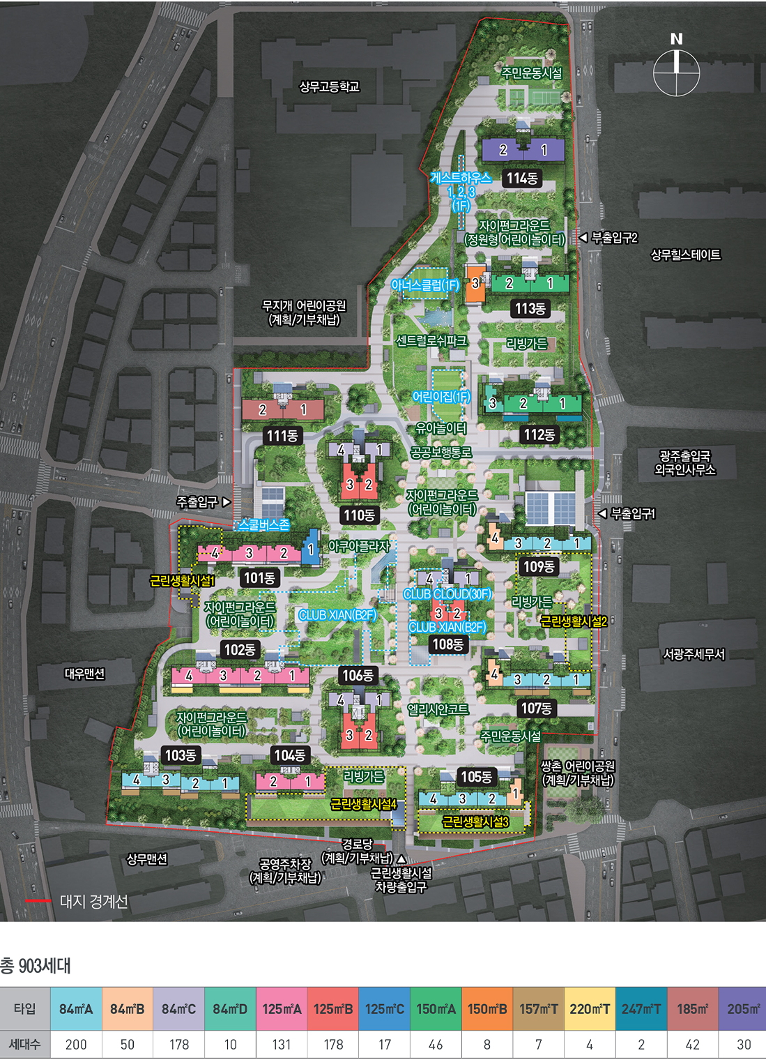 상무센트럴자이는 지하 3층~지상 최고 30층, 14개 동, 전용면적 84~247㎡ 총 903세대 규모로 조성되는데,