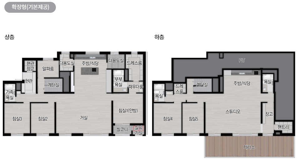 전용면적별로는 ▲84㎡ 438가구 ▲125㎡ 326가구 ▲150㎡ 54가구 ▲185㎡ 42가구 ▲205㎡ 30가구 ▲157~247㎡ T 13가구로 구성된다. 특히 ▲157~247㎡ T 타입은 2층 복층으로 설계된 스튜디오 테라스하우스다.