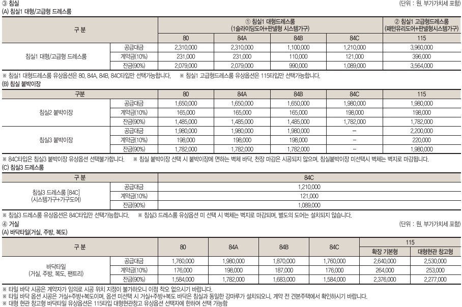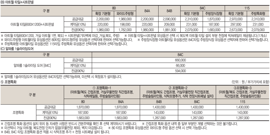 전용면적별로 80㎡형 144세대, 84㎡A형 232세대, 84㎡B형 311세대, 84㎡C형 99세대, 115㎡형 87세대로 구성되었다.