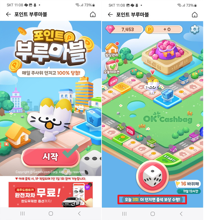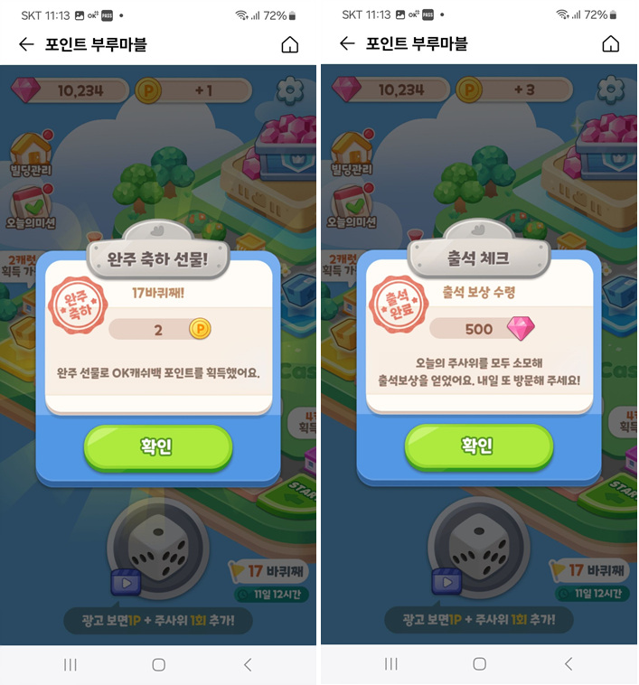 말판을 한바퀴 돌면 완주 선물로 OK포인트 2를 획득하고, 주사위 3번 돌리면 출석 보상으로 500캐럿을 선물로 받는다.