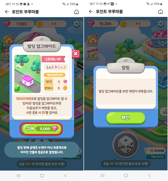 매일같이 주사위만 돌려도 광고만 봐도 포인트를 획득하고 캐럿을 통해 건물을 업그레이드 시킬 수 있다는 것.
