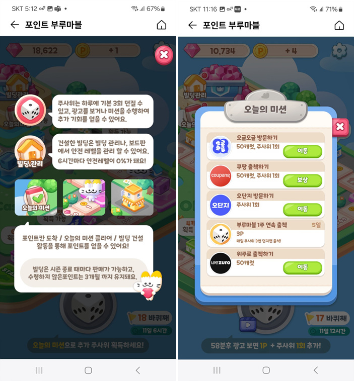 그래서 포인트부루마블은 주사위 돌려서 건물 짓고, 시간되면 캐럿으로 보상 수령하고, 광고보고 주사위 던지기 추가 받고 해서,